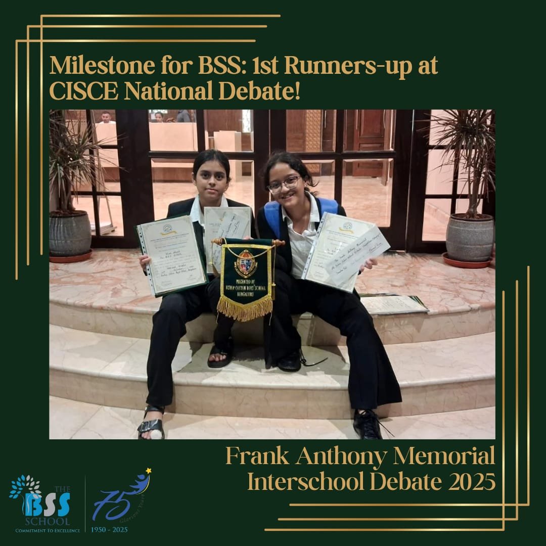 The BSS School, Kolkata, secured the First Runner-Up position in the National Finals of the prestigious Frank Anthony Memorial Inter-School Debate, held at Bishop Cotton Boys’ School, Bengaluru, on 25th September 2025. The motion was: “Is AI Integrated Learning the Future of Education?”