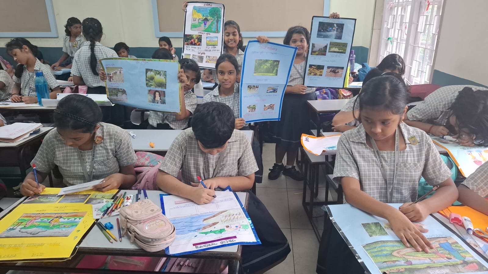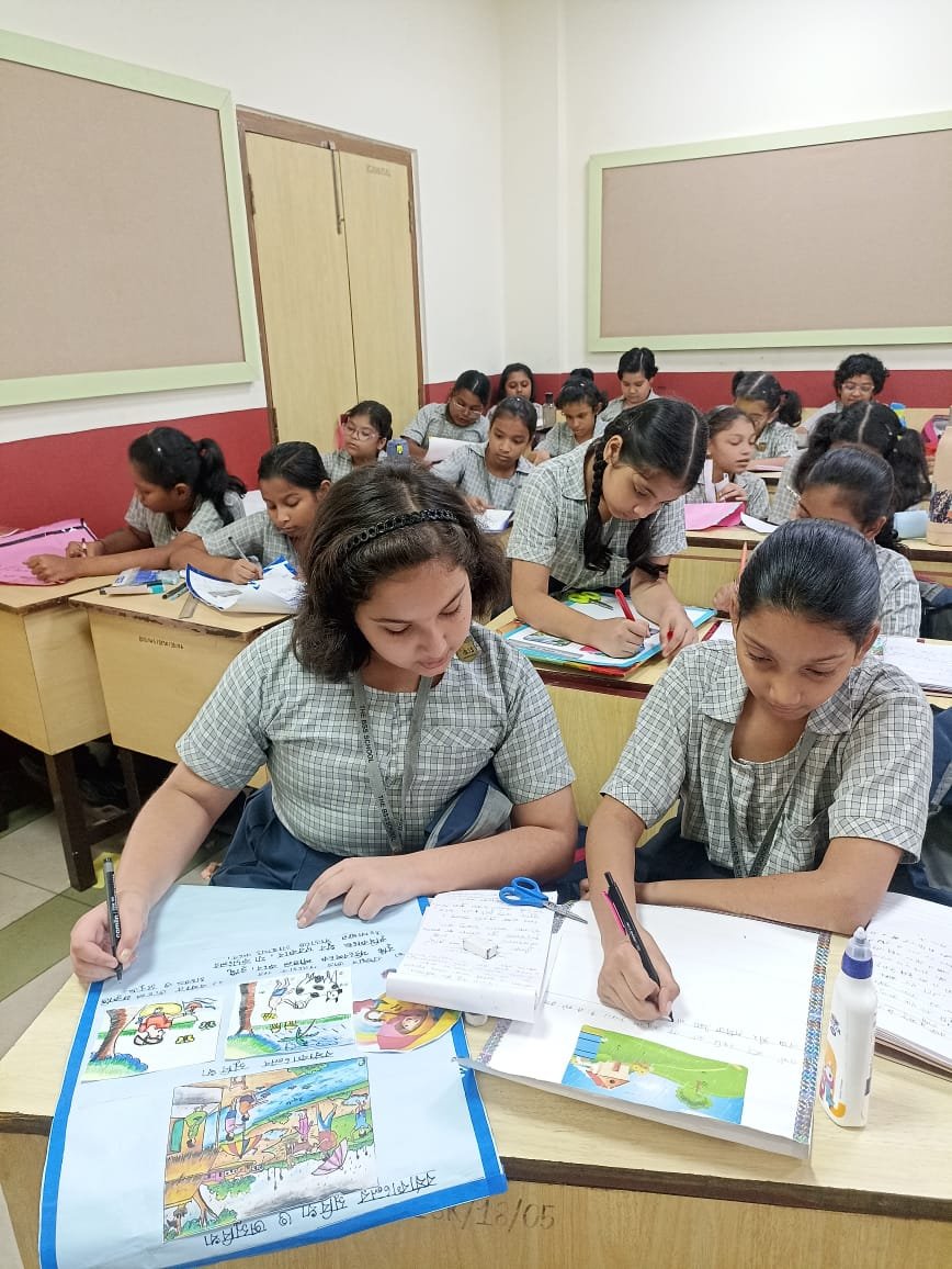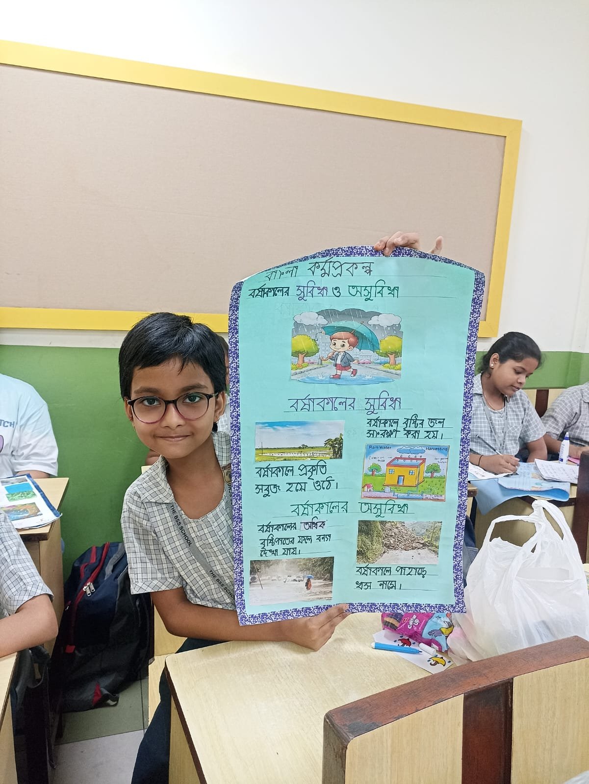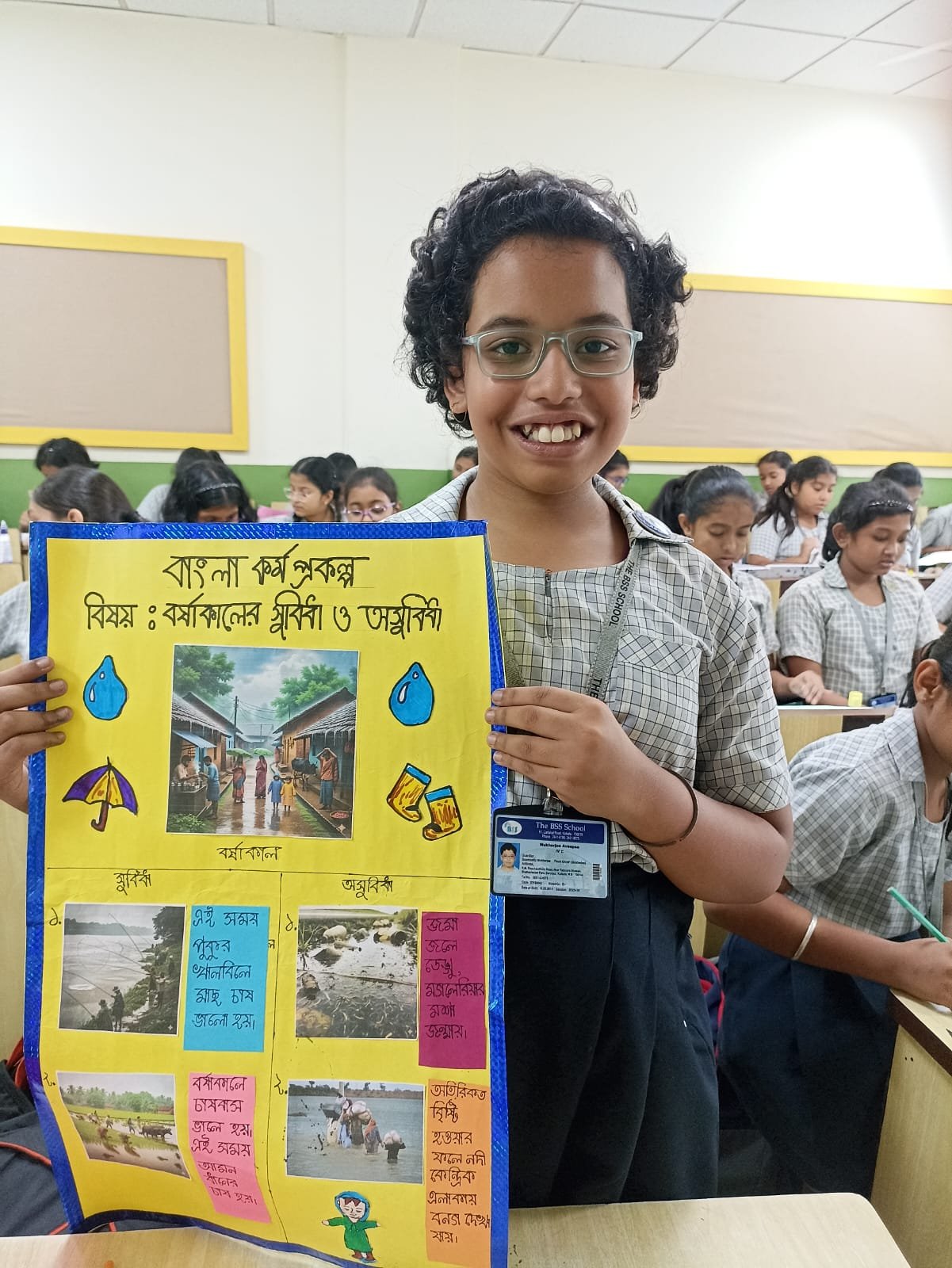 They described how rain brings cool weather, greenery and joy, but also causes waterlogging, muddy roads, and sickness. The activity helped them express their thoughts creatively and understand both the advantages and difficulties of this season.