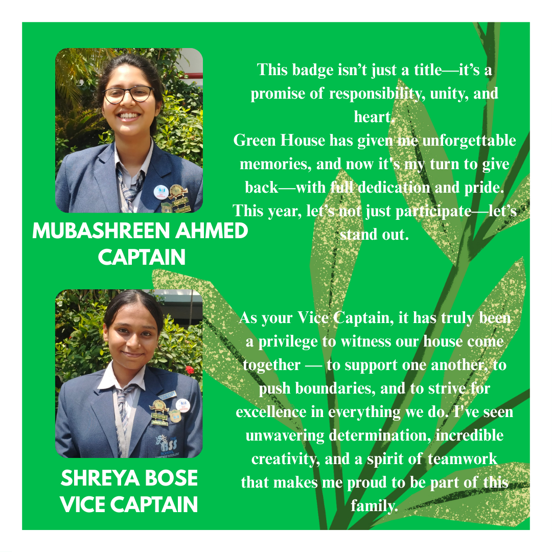 Voices of strength, minds of clarity – presenting the Captain and Vice Captain of Sarojini Naidu House. With eloquence and empathy, they’re set to lead the Green House to glory!