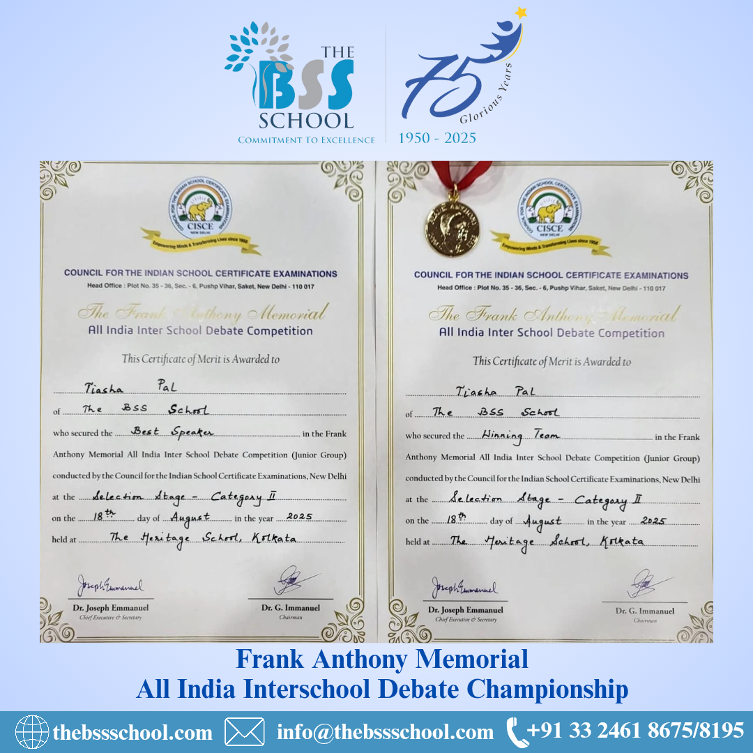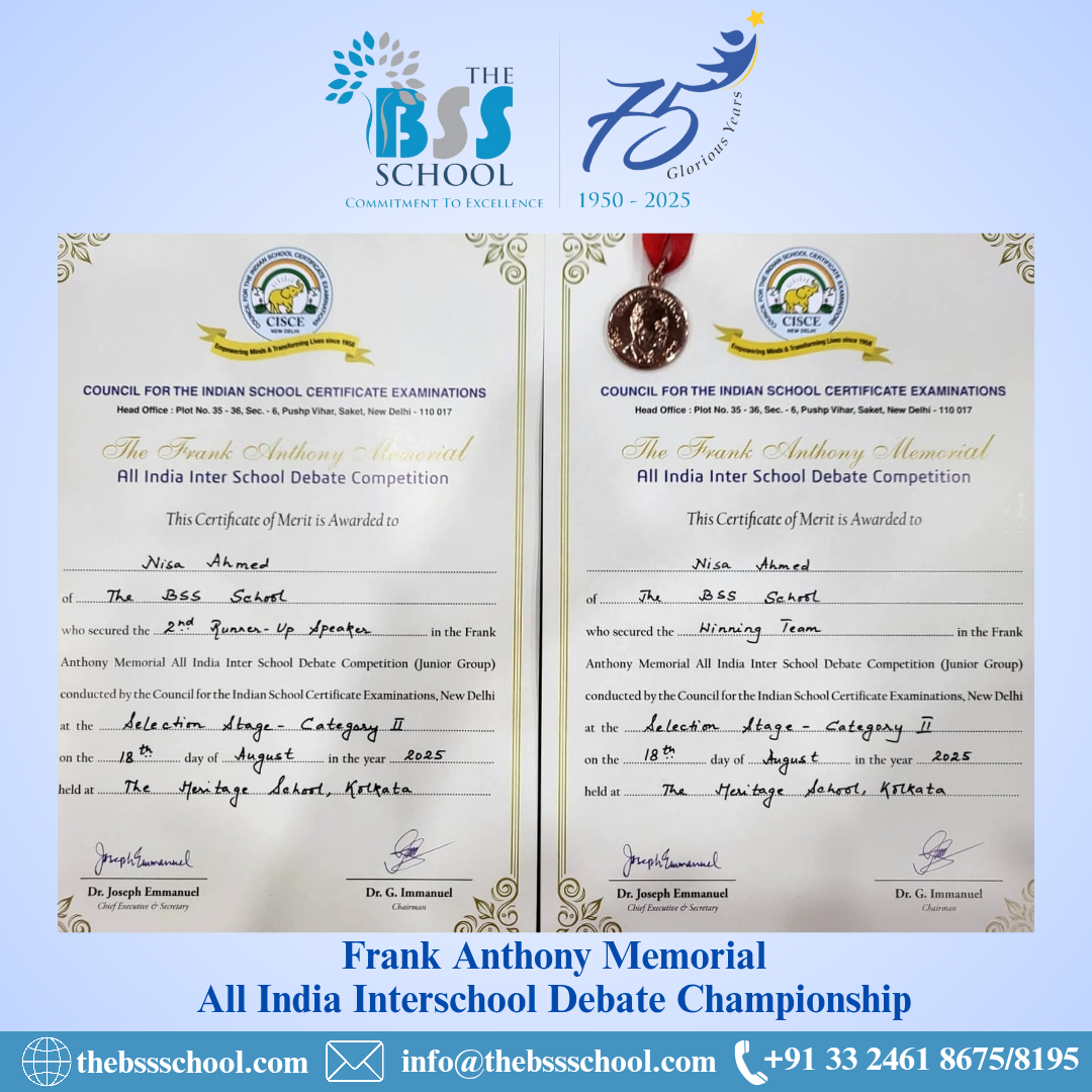 The BSS School qualifies for the National Round of the Frank Anthony Memorial Inter-School Debate Championship 2025!